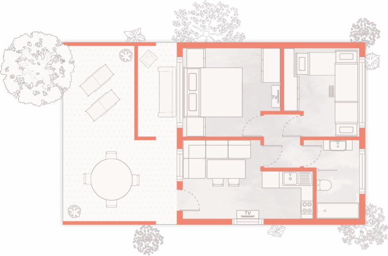 Das Bungalow Design Eleven bietet denselben Komfort und den zeitgemäßen Stil der anderen Bungalow mit Räumen, die so gestaltet sind, dass sie Barrierefreiheit und Bewegungsfreiheit gewährleisten. Eine ideale Lösung für alle, die einen komfortablen Urlaub ohne Barrieren suchen.