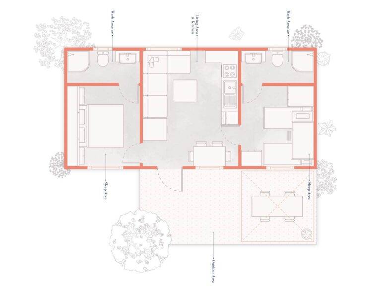 In Chalet Sole Classic II, warm brown tones combine with bright, welcoming interiors. Available with a tiled terrace (units 21 to 30) or a wooden terrace (units 31 to 36), these chalets feature two bedrooms and two bathrooms, ideal for guests seeking comfort and style surrounded by nature.
