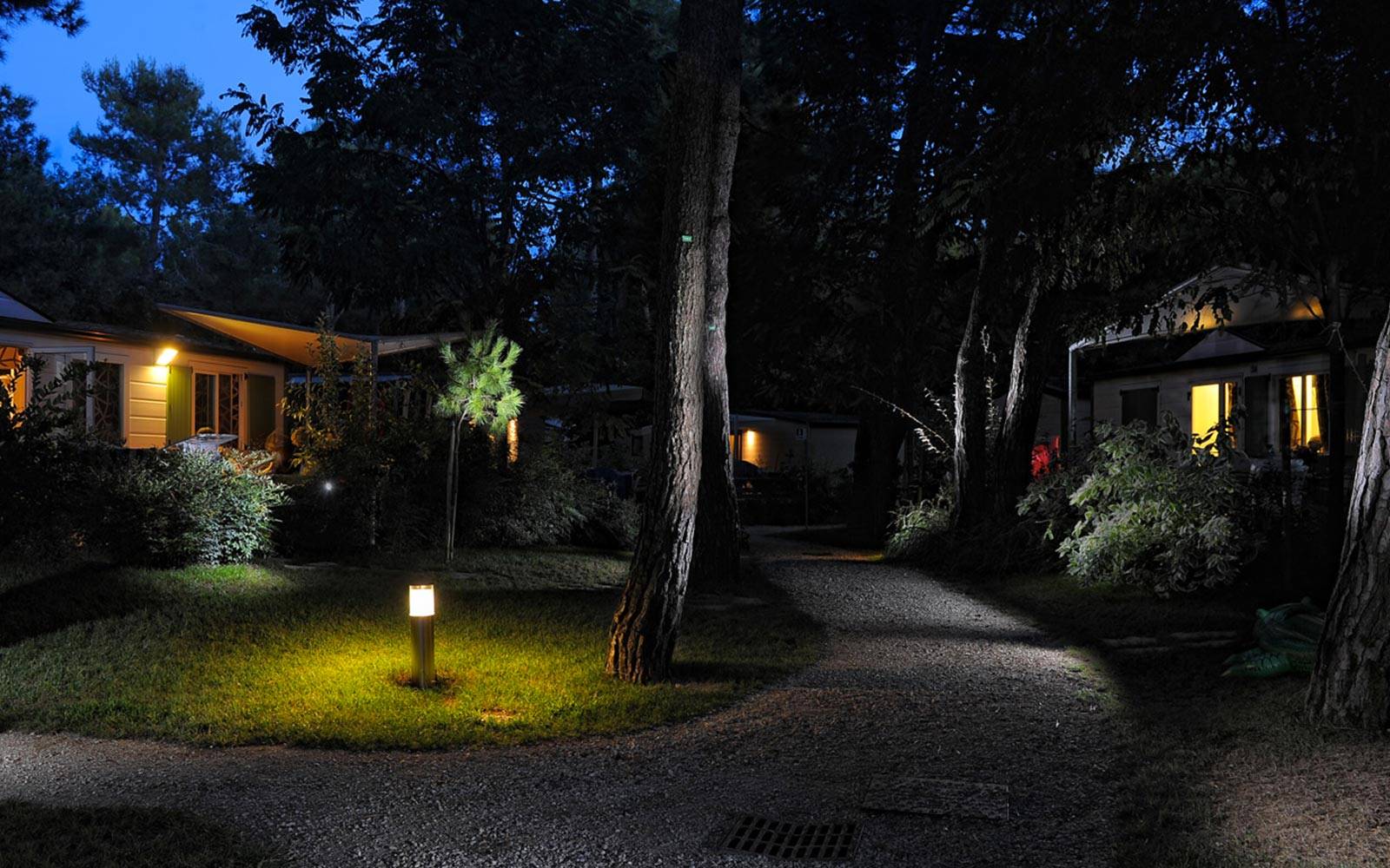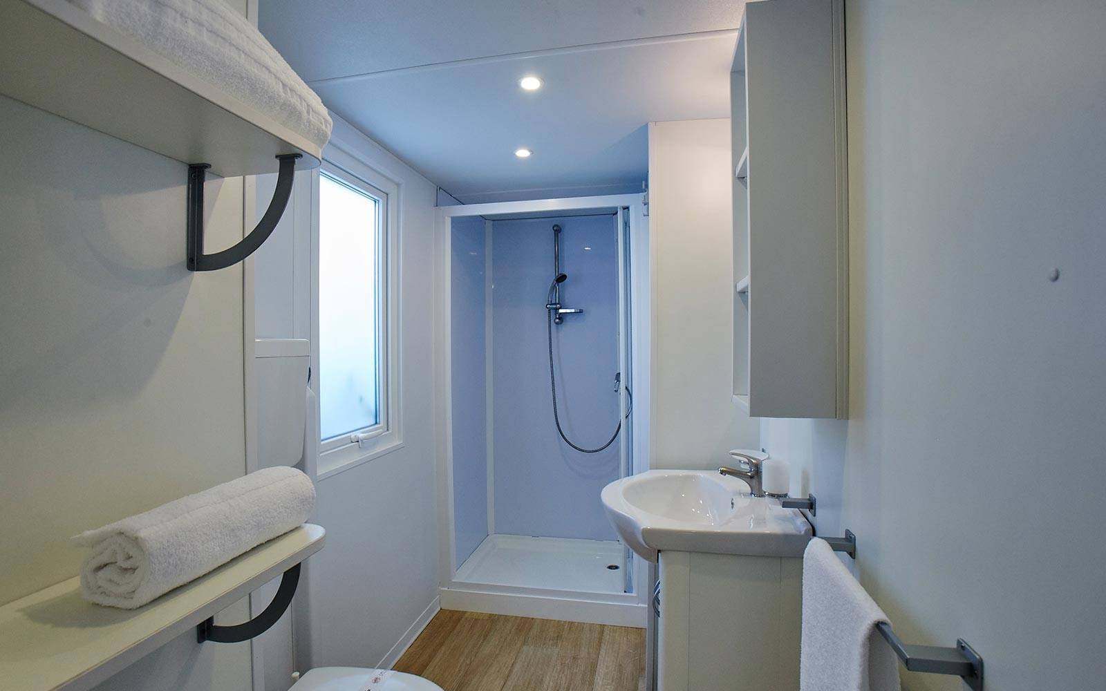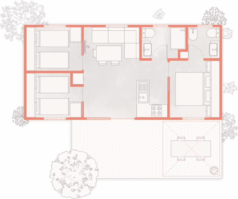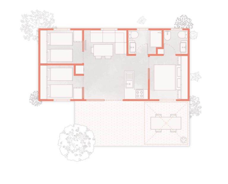 Chalet Sole Six Beds II features generous living space with three bedrooms, two bathrooms, and a fully equipped kitchen. The wooden terrace with outdoor dining area is ideal for sharing relaxed moments together, while air conditioning, a safe, and a reserved beach area ensure a comfortable and worry-free holiday.