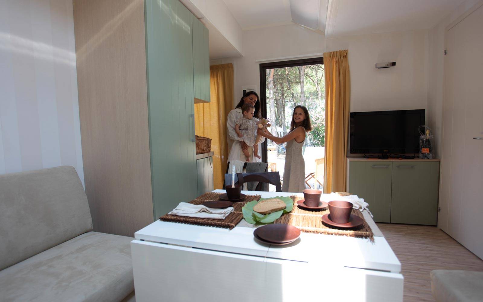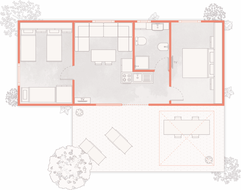 Perfetto per le famiglie numerose, lo Chalet Natura Family dispone di una cameretta con tre letti singoli, una camera matrimoniale e un bagno ampio e funzionale. La cucina è moderna e ben accessoriata, mentre la terrazza rialzata diventa un’estensione naturale del soggiorno. Comfort, privacy e praticità per una vacanza all’insegna della condivisione.