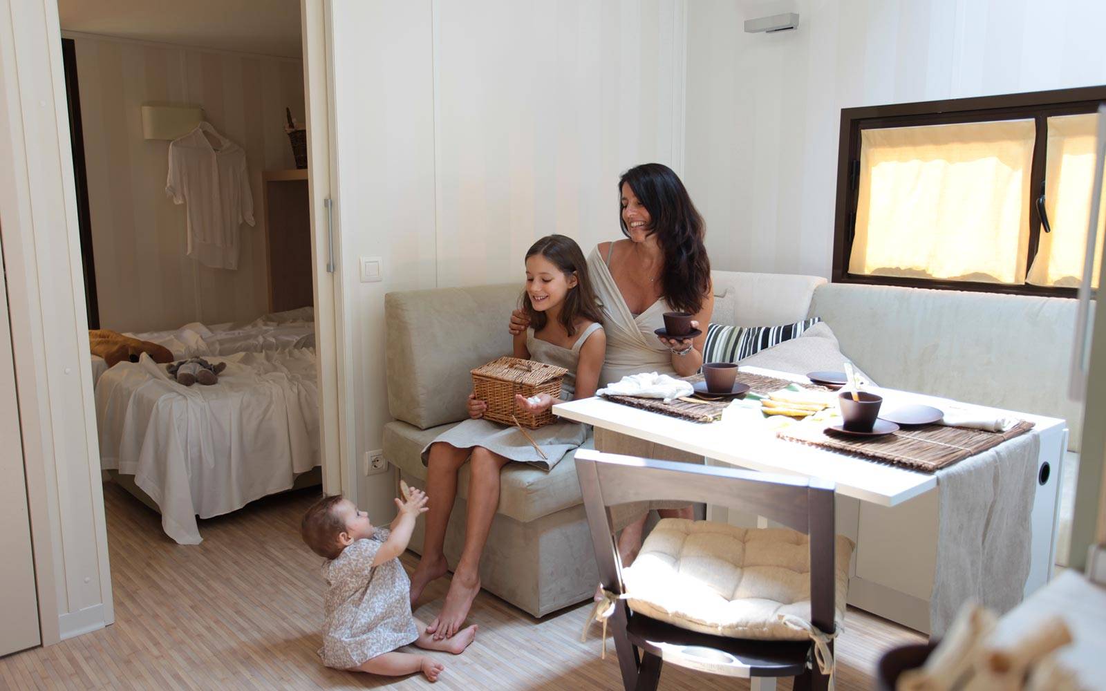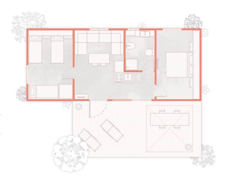Progettato per la vita all’aria aperta in famiglia, lo Chalet Natura Family offre ambienti ampi e luminosi con un solo bagno e una grande terrazza in legno dove condividere momenti di relax e convivialità.