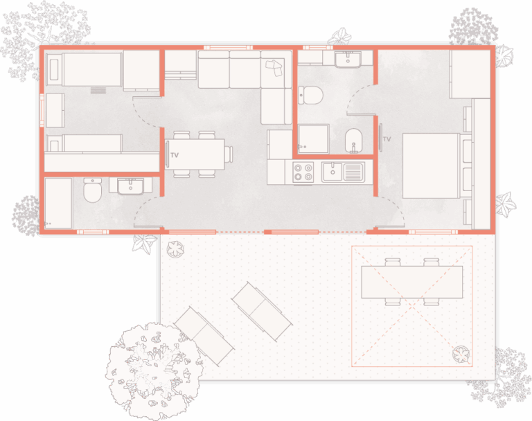 Ampio e raffinato, lo Chalet Natura Superior offre due camere, due bagni e un soggiorno luminoso con divano letto. La cucina attrezzata con lavastoviglie, microonde e macchina del caffè è pensata per il massimo comfort, mentre la terrazza rialzata in legno regala spazio per vivere all’aperto. Un alloggio di pregio con tutti i servizi per un soggiorno esclusivo.
