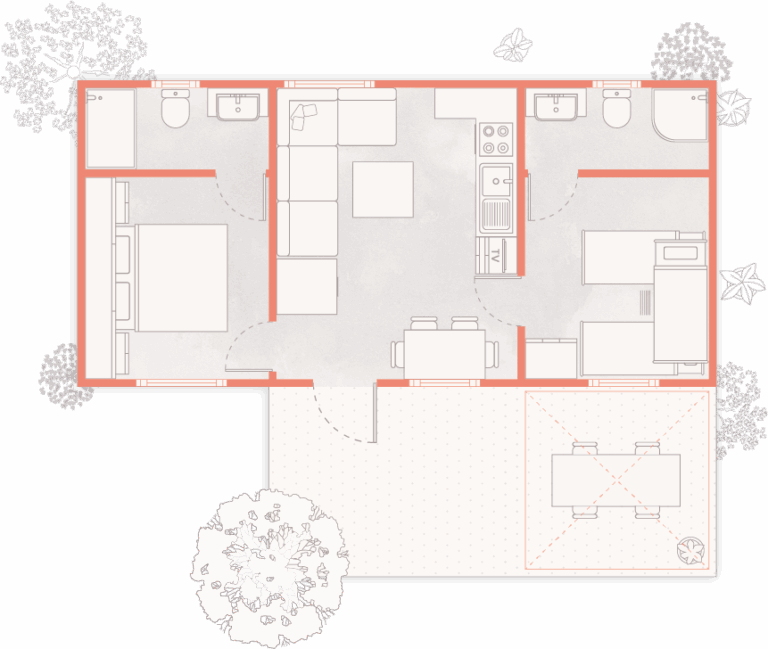 Accoglienti e funzionali, gli Chalet Sole Classic I offrono una cucina completamente attrezzata, soggiorno con divano letto e due camere luminose. I due bagni garantiscono praticità per tutta la famiglia, mentre la terrazza pavimentata con tendalino e arredi da esterno invita a vivere momenti di relax all’aria aperta.